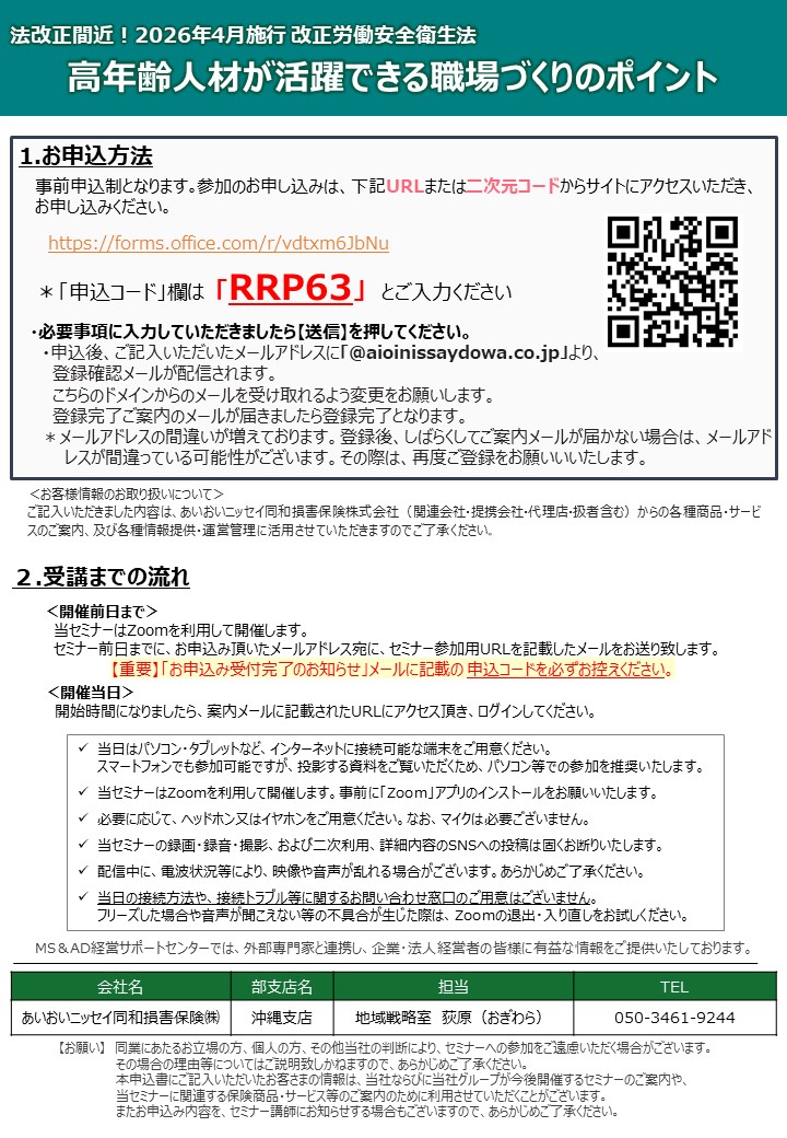 本セミナーでは、企業の労災事故や労務トラブルの防止策など、高齢者が安心して働くことのできる職場環境や規程の整備等について、経験豊富な講師がわかりやすく解説いたします。
